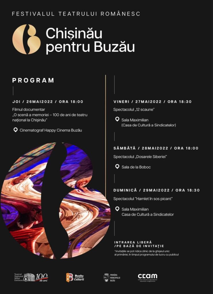 Dragi spectatori, preț de câteva zile – începând cu ziua de azi, 26 mai până pe 29 mai, vom fi la Festivalul Teatrului Românesc “Chișinău pentru Buzău”.